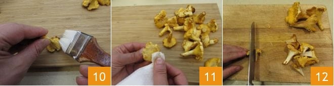 Pendant que les flans de Grana cuisent, nettoyez les girolles : brossez délicatement la partie sous le chapeau pour enlever les traces de terre entre les plis 10 et nettoyez-les avec un chiffon doux 11. Ensuite, coupez-les en deux 12.