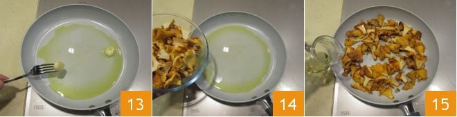 Dans une large poêle, faites revenir une gousse d'ail pelée et coupée en deux, puis retirez-la 13 et ajoutez les champignons 14. Faites-les cuire à feu vif en les arrosant de vin blanc 15 ; laissez-les cuire environ 8 minutes.