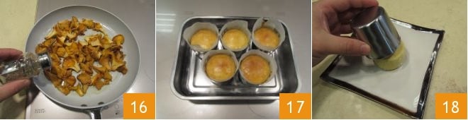 Salez et poivrez, puis éteignez le feu 16. Une fois les flans prêts, quand une délicieuse croûte s'est formée à la surface 17, sortez-les du four, enlevez le papier sulfurisé et retournez-les sur un plat de service 18.