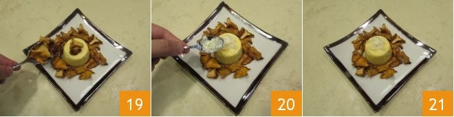 Puis décorez chaque flan avec les girolles 19 et des copeaux de Grana 20. Vos flans de Grana avec girolles sont prêts à être dégustés 21!