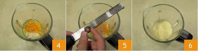 puis les œufs 4 et aromatisez avec la noix de muscade 5. Salez et mixez le tout jusqu'à l'obtention d'un mélange crémeux et homogène 6.
