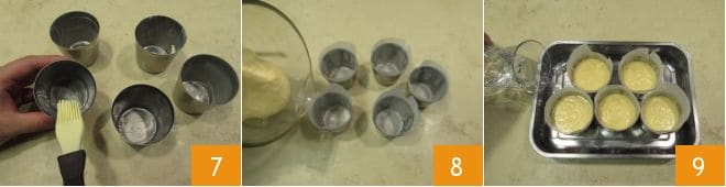 Prenez des moules de 7 cm de diamètre et 6,5 de hauteur, badigeonnez-les d'huile 7 et tapissez-les de bandes de papier sulfurisé suffisamment larges pour que les bords dépassent des moules 8 : de cette manière, vous pourrez détacher plus facilement les flans des bords une fois cuits. Versez le mélange à l'intérieur en laissant environ 1 cm du bord, puis placez-les dans un plat à bords hauts et versez de l'eau (à température ambiante) dans le plat, de manière à ce qu'elle couvre les moules sur quelques centimètres 9. Faites cuire les flans dans un four ventilé préchauffé à 160° pendant 45 minutes (ou statique à 180° pendant 50-55 minutes).