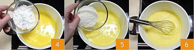 Ajoutez ensuite la fécule de maïs (en alternative vous pouvez utiliser de la fécule de pomme de terre) et la farine préalablement tamisées (4-5) et mélangez le tout jusqu'à obtenir un mélange homogène 6.