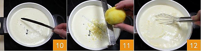 Ajoutez la gousse et ses graines dans le mélange d'œufs et de lait 10 et enfin râpez le zeste d'un demi-citron 11 ; laissez cuire, à feu doux, en remuant incessamment avec un fouet 12, pendant environ 15 minutes ou jusqu'à ce qu'elle ait atteint une consistance crémeuse et compacte, comme celle de la crème pâtissière.