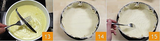 Une fois prête, retirez la gousse de vanille de la crème 13. Prenez le rouleau de pâte feuilletée, qui doit être bien froid du réfrigérateur, déroulez-le et déposez-le, avec son papier sulfurisé, dans un moule à charnière de 24 cm de diamètre environ 14 puis percez le fond avec les dents d'une fourchette 15, afin que la pâte ne gonfle pas trop pendant la cuisson.