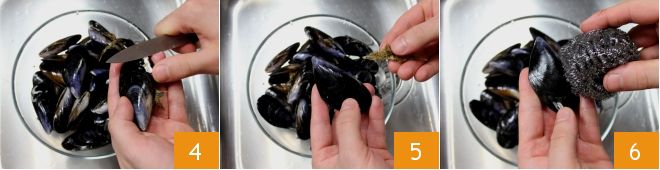 Passez ensuite aux moules (vous pouvez consulter la fiche de l'École de cuisine : comment nettoyer les moules pour suivre le procédé étape par étape). Lavez les moules sous l'eau courante, puis avec le dos d'un couteau, éliminez toutes les incrustations et les bernacles 4 (parasites, de couleur blanche ou grise, qui se forment sur la coquille) et, avec un mouvement énergique, retirez manuellement la barbe, ou byssus, qui sort des valves 5. Toujours sous l'eau fraîche courante et en utilisant une paille de fer (ou une brosse rigide), frottez énergiquement les moules pour éliminer toute impureté 6.