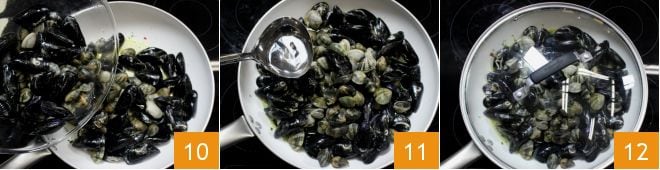 Ajoutez les moules et les palourdes (préalablement rincées pour enlever la saveur de l'eau salée) 10, arrosez-les avec 3 louches d'eau 11 et couvrez-les avec un couvercle 12. Faites cuire jusqu'à l'ouverture complète des valves.