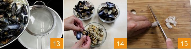Lorsque les valves sont ouvertes, éteignez le feu et filtrez le liquide des mollusques 13, pour le recueillir dans une casserole que vous aurez préalablement remplie d'environ 2 litres d'eau. Allumez le feu doux sous la casserole et portez le bouillon à ébullition. Entre-temps, laissez refroidir les mollusques, puis débarrassez-les de leurs coquilles et recueillez les fruits dans un petit bol 14. Ensuite, passez à éplucher et hacher finement l'échalote 15.