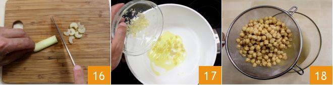 Lavez et épluchez la moitié de la branche de céleri avec un économe ou un couteau, puis hachez-la finement 16. Dans une grande casserole profonde, versez un filet d'huile, ajoutez le hachis fin d'échalote et de céleri 17 et faites revenir pendant 1 minute. Ensuite, égouttez les pois chiches qui auront été réhydratés après les heures de trempage 18.