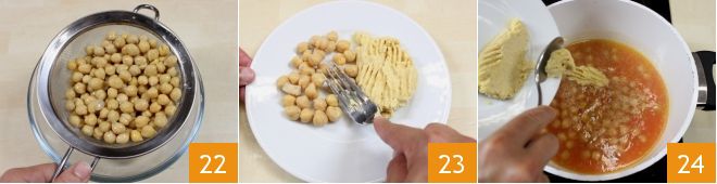 Passé le temps indiqué, en laissant le feu allumé, prélevez dans la casserole deux cuillères à soupe de pois chiches 22, placez-les sur une assiette et écrasez-les avec une fourchette 23 pour obtenir une purée. Ensuite, versez la purée obtenue dans la casserole avec le reste des pois chiches en cuisson 24 et laissez épaissir. Mélangez et laissez cuire encore quelques minutes.