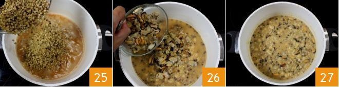 Ajoutez également la fregola aux pois chiches 25, mélangez et faites cuire à feu doux en ajoutant au fur et à mesure quelques louches de bouillon. Ensuite, ajoutez également les moules et les palourdes que vous aviez décortiquées 26, faites cuire encore 4-5 minutes, jusqu'à ce que la préparation ait atteint la consistance d'une soupe épaisse. Rectifiez l'assaisonnement en sel et poivre à votre goût, puis éteignez le feu et votre fregola avec moules, palourdes et pois chiches sera prête à être servie 27!