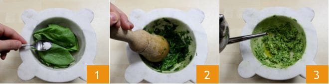 Pour préparer l'omelette au pesto et tomates, commencez par le pesto génois (si vous avez déjà du pesto maison, vous pouvez l'utiliser dans la quantité indiquée). Pour consulter la procédure complète, vous pouvez cliquer sur la fiche de l'École de cuisine que vous trouverez ici : Pesto alla Genovese. Réduisez la gousse d'ail en crème en la pilant dans un mortier (si vous n'en avez pas, vous pouvez utiliser le mixeur). Ensuite, ajoutez les feuilles de basilic 1 avec une pincée de gros sel. Écrasez les feuilles de basilic contre les parois du mortier en tournant le pilon de gauche à droite et simultanément le mortier dans l'autre sens 2. Lorsque le liquide vert brillant s'échappe des feuilles, ajoutez les pignons de pin et continuez à piler. Ensuite, ajoutez les fromages râpés au fur et à mesure, en continuant à piler ; enfin, versez l'huile d'olive extra vierge en filet 3. Mélangez bien les ingrédients. Maintenant que le pesto est prêt, mettez-le de côté couvert de film alimentaire.