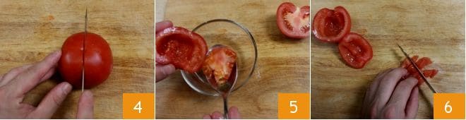 Consacrez-vous ensuite à préparer les tomates. Lavez-les sous l'eau courante, puis réduisez-en une en dés : retirez le pédoncule et coupez-la en deux 4, puis creusez l'intérieur avec une cuillère pour enlever les graines 5. Ensuite, coupez la chair en dés 6 et conservez-les dans un petit bol.
