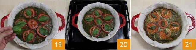 Décorez l'omelette avec les feuilles de basilic entières 19, en les disposant sur chaque tranche de tomate pour créer un contraste de couleurs. Ensuite, enfournez 20 dans un four statique préchauffé à 180° pendant 30-35 minutes ou dans un four ventilé à 160° pendant environ 25 minutes jusqu'à ce que la surface soit dorée (vous pouvez aussi cuire l'omelette dans une poêle antiadhésive comme une omelette normale). Sortez l'omelette au pesto et tomates du four 21, laissez tiédir et servez-la tiède ou froide à votre goût !