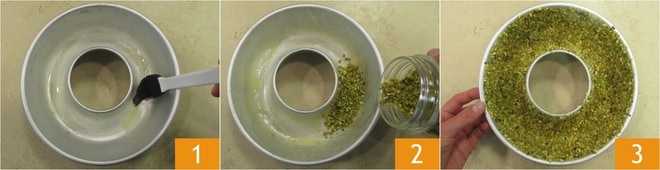 Pour réaliser le gâteau à l'orange, commencez par beurrer le moule à gâteau 1 et saupoudrez les morceaux de pistaches 2 de manière à le recouvrir entièrement 3. Mettez de côté et passez à la préparation de la pâte.