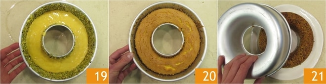 Faites cuire dans un four statique préchauffé à 170° pendant environ 40 minutes 19. Vérifiez la cuisson avec un cure-dent, puis sortez du four et laissez tiédir dans le moule 20. Une fois tiède, retournez le gâteau sur le plat de service et laissez refroidir complètement 21.