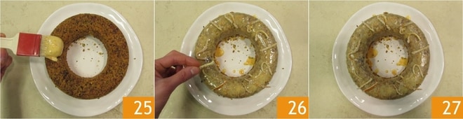 Brossez la surface du gâteau avec le glaçage 25, puis décorez avec des zestes d'orange confits 26. Votre gâteau à l'orange est prêt à être servi 27 !