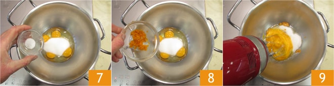 Ajoutez le sel 7 et le zeste d'oranges râpé 8. Mélangez avec un fouet tout en portant le mélange à la température de 45° 9.