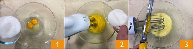 Pour préparer le gâteau à la poêle, commencez par mettre les œufs et environ la moitié du sucre dans un bol 1. Commencez à travailler avec le batteur électrique et ajoutez progressivement le sucre restant 2. Continuez à travailler avec le batteur jusqu'à ce que les œufs deviennent clairs et mousseux. Ajoutez ensuite le zeste râpé du citron 3.
