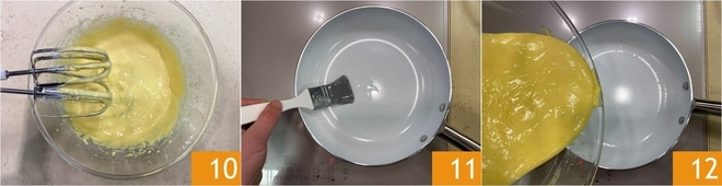 Dès que la farine et la levure sont bien amalgamées, éteignez le batteur 10. Maintenant, huilez avec de l'huile de graines une poêle de 20 cm à la base et 24 cm en surface et chauffez-la à feu doux ; si vous utilisez des plaques à induction, réglez-la à 3. Si vous utilisez une cuisinière à gaz, suivez les indications de cuisson reportées dans le conseil. Assurez-vous que la poêle est bien huilée sur toute la surface, puis versez la pâte à l'intérieur 12.