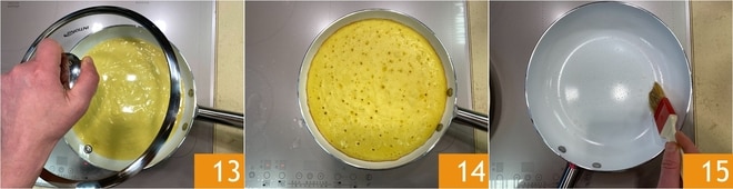 Couvrez avec un couvercle 13 et faites cuire le gâteau pendant 45 minutes de cette manière. À ce stade, vous verrez que le gâteau ne sera plus liquide et que des bulles se seront formées. Huilez une assiette et retournez le gâteau à l'intérieur de l'assiette. Puis, huilez à nouveau la poêle 15.