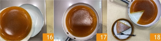 Faites glisser le gâteau à l'intérieur de la poêle 16 et laissez cuire encore 15 minutes, toujours à la même température, mais cette fois sans couvercle 17. Une fois cuit, laissez refroidir, saupoudrez de sucre glace et servez votre gâteau à la poêle 18 !