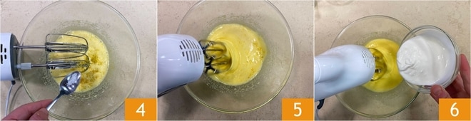Ajoutez une pincée de sel 4 et mélangez avec le batteur 5. Ensuite, ajoutez le yaourt 6 et continuez à mélanger jusqu'à ce qu'il soit bien incorporé.