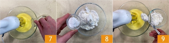 Maintenant, réduisez la vitesse du batteur et versez lentement l'huile en filet 7. Dans un petit bol, mélangez la farine avec la levure 8 et tamisez-les. Incorporez les ingrédients secs petit à petit à la pâte, toujours avec le batteur à basse vitesse 9.