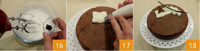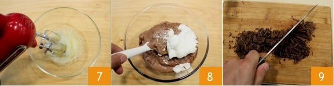 Dans un récipient, montez les blancs d'œufs en neige avec un batteur électrique que vous avez mis de côté 7 ; lorsque les blancs d'œufs sont montés, incorporez-les délicatement au mélange, en trois fois, avec la spatule 8, en mélangeant de bas en haut pour éviter que le mélange ne se défasse. Ensuite, avec un couteau, hachez très finement le chocolat noir 9,