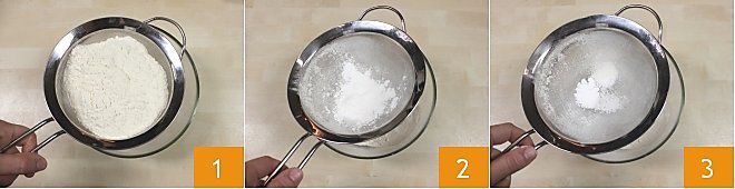 Pour préparer le gâteau aux carottes et limoncello, commencez par tamiser la farine 1, la levure 2 et le bicarbonate 3. Mettez-les de côté, car vous allez les incorporer petit à petit lors de la préparation de la pâte.