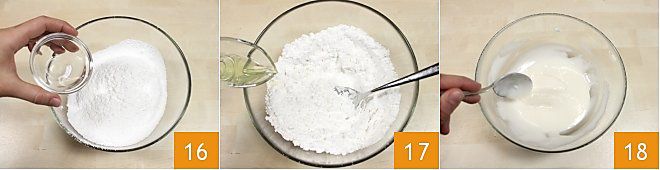 Entre-temps, préparez le glaçage : chauffez au micro-ondes, pendant environ une minute à pleine puissance ou dans une casserole, l'eau et le limoncello. Dans un bol, versez le sucre glace tamisé, ajoutez l'eau et le limoncello tièdes (16-17) et mélangez bien avec une cuillère pour dissoudre les grumeaux 18.