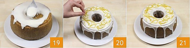 Lorsque le gâteau est refroidi, laissez-le sur la grille et versez dessus le glaçage à l'aide d'une cuillère 19. Décorez ensuite la surface avec des zestes de citron confits 20 et votre gâteau aux carottes et limoncello est prêt à être servi et dégusté 21 !