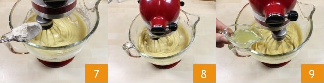 Prenez la farine, la levure et le bicarbonate que vous avez tamisés au début et incorporez-les petit à petit au mélange 7, en ajoutant également 2 pincées de sel. Lorsque le mélange sera bien homogène 8, versez le limoncello 9.