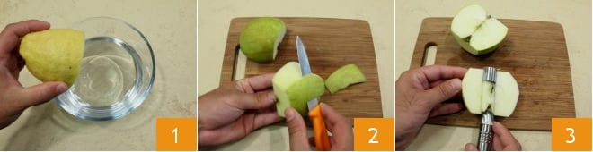 Pour préparer le gâteau aux pommes et carottes, commencez par préparer l'eau acidulée qui servira à empêcher les pommes de noircir une fois coupées : pressez le jus de 1 citron 1, filtrez-le, puis versez-le dans deux bols avec de l'eau froide. Lavez les pommes vertes sous l'eau fraîche courante, puis épluchez-les 2 ; coupez une pomme en quartiers et enlevez le cœur central avec un vide-pomme 3.