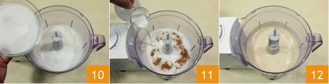 Versez le sucre 10, la cannelle en poudre et le lait en filet 11, puis mettez le mixeur en marche jusqu'à obtenir un mélange dense et homogène 12.