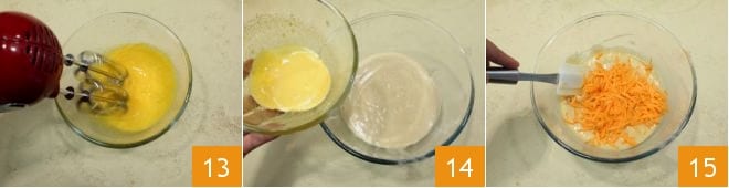 Dans un petit bol à part, séparez les jaunes des blancs d'œufs, en mettant de côté ces derniers ; battez les jaunes 13 avec un batteur électrique et ajoutez-les au mélange obtenu 14 avec la carotte râpée 15.