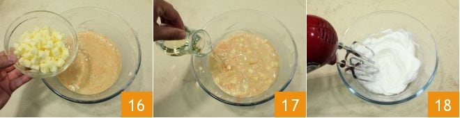 Ajoutez les dés de pommes bien égouttés de l'eau acidulée 16, puis l'huile en filet 17, en mélangeant bien avec une spatule pour intégrer tous les ingrédients. Dans un bol à part, montez avec un batteur électrique ou à la main les blancs d'œufs que vous avez réservés 18;