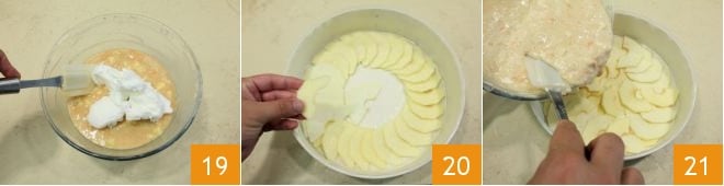 quand les blancs d'œufs sont devenus blancs et mousseux, ajoutez-les au mélange en mélangeant avec la spatule de bas en haut 19. À ce stade, beurrez et tapisser avec du papier sulfurisé un moule de 22 cm de diamètre puis recouvrez toute la base avec les pommes coupées en lamelles (bien égouttées de l'eau et citron) côte à côte, en couvrant toute la surface de manière uniforme 20. Une fois terminé, versez délicatement le mélange 21.