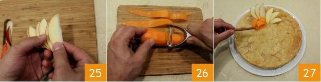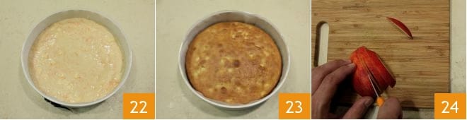 Nivelez bien la pâte à l'aide d'une spatule 22 et faites cuire dans un four statique préchauffé à 170° pendant 60 minutes (ou 150° pendant 50 minutes si four ventilé) : si la surface du gâteau devient trop sombre, à mi-cuisson, couvrez le gâteau avec du papier sulfurisé ou de l'aluminium. Une fois cuit 23, sortez-le du four et laissez-le reposer dans le moule pendant 5 minutes ; puis démoulez-le et placez-le sur une grille pour le laisser refroidir complètement. Maintenant, vous pouvez procéder à la décoration : lavez sous l'eau fraîche courante la pomme rouge, coupez-la en deux sans l'éplucher puis en tranches 24.