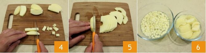 Réduisez la pomme en dés 4, en les mettant dans le bol avec l'eau et le citron au fur et à mesure que vous les coupez, puis prenez la deuxième pomme et coupez-la en lamelles 5, en les mettant toujours dans l'eau et le citron 6.