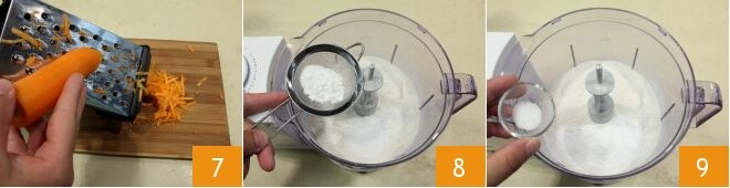 Lavez et épluchez les carottes, puis râpez-les 7 et mettez de côté. Dans un mixeur, placez la farine tamisée avec la levure 8 puis ajoutez la pincée de sel 9.