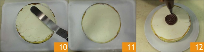 et nivelez la surface avec une spatule 10. Transférez le gâteau au réfrigérateur pendant au moins 2 heures. Une fois raffermie 11, commencez à décorer avec du Nutella® inséré dans une poche à douille avec une douille cannelée: vous devrez obtenir une spirale pour couvrir toute la surface, vous pouvez commencer par le centre et faire des cercles concentriques 12.