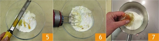Ajoutez également le miel, le zeste râpé d'un demi-citron et d'une demi-orange 5, ajoutez également 200 g de crème fraîche liquide. Travaillez les ingrédients avec un fouet électrique 6 jusqu'à obtenir une crème lisse. Faites chauffer dans une petite casserole les 20 g de crème fraîche liquide restants et la gélatine égouttée et pressée délicatement 7: faites fondre très bien la gélatine.