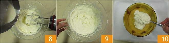 Versez le tout sur la crème de mascarpone 8 et travaillez quelques secondes avec le fouet électrique. Une fois prête 9, versez la crème au mascarpone et à la crème dans le moule 10
