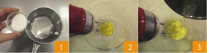 Pour réaliser la gaufre de pandoro avec mousse de ricotta et Nutella®, commencez par faire tremper la gélatine dans de l'eau froide, puis préparez le sirop : versez 15 g d'eau dans une casserole, ajoutez 40 g de sucre 1 et portez le mélange à une température de 121°C. Mettez les jaunes d'œufs dans un bol et travaillez-les avec un fouet électrique 2, puis versez le sirop de sucre en filet 3