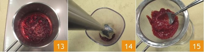 et faites cuire brièvement, juste le temps de faire fondre le sucre 13. Transférez la sauce dans un récipient haut et étroit et mixez avec un mixeur plongeant 14, puis passez-la à travers un tamis fin 15 et réservez.