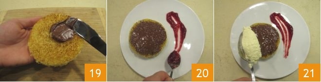 Une fois refroidis, tartinez les disques de pandoro avec 15 g de Nutella® chacun 19, déposez-les sur une assiette de service et badigeonnez l'assiette avec la sauce aux fruits rouges 20. Ajoutez une quenelle de mousse de ricotta sur la gaufre de pandoro 21