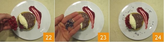 et garnissez avec une framboise et une branche de groseilles 22. Enfin, décorez l'assiette avec des fleurs comestibles 23 : votre gaufre de pandoro avec mousse de ricotta et Nutella® est prête à être servie 24 !