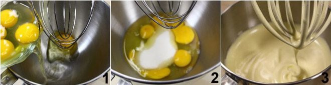 Pour préparer la génoise avec farine de riz, commencez par mettre les œufs à température ambiante dans un batteur sur socle 1, ajoutez ensuite le sucre 2 et fouettez les ingrédients pendant au moins 10/15 minutes jusqu'à obtenir un mélange mousseux, gonflé et de couleur jaune clair 3.