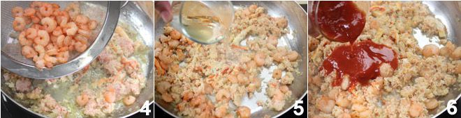 et les crevettes 4. Arrosez ensuite avec le vin blanc 5 et laissez-le s'évaporer. Ajoutez maintenant la purée de tomates 6 et salez.